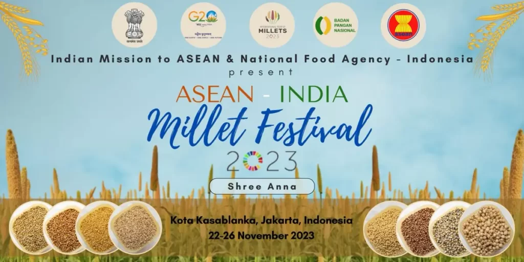 The ASEAN-India Millet Festival 2023, organised by the Indian Mission to ASEAN in partnership with the Ministry of Agriculture and Farmers’ Welfare, will take place in Indonesia from November 22nd to November 26th, 2023.