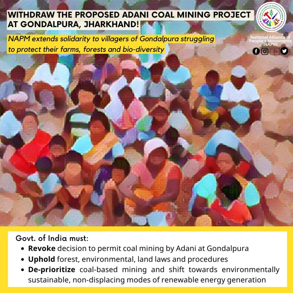 Extending solidarity to the villagers protesting since many months against Adani’s proposed mine at the Gondalpura coal block in Hazaribagh, Jharkhand, the National Alliance of People’s Movements (NAPM)demanded that the Govt. of India to immediately revoke the decision to permit it.