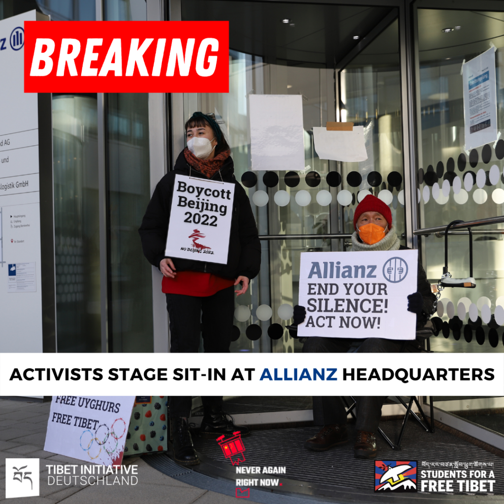 This action comes more than two weeks after activists from Tibet Initiative Deutschland (TID) dropped off a petition to Allianz with more than 46,000 signatures calling on the company to cancel its deal with Beijing 2022. TID gave the insurance giant two weeks to respond, but received no reply.