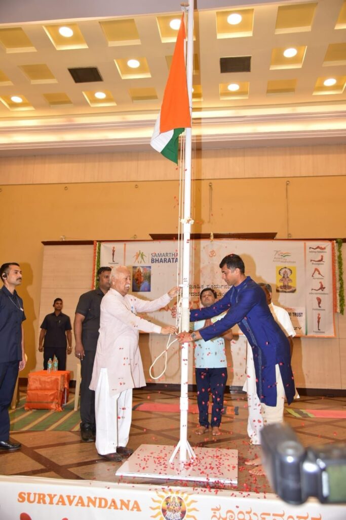 RSS Sarsanghchalak Dr Mohan Bhagwat hoisted the national flag on the occasion of 77th Independence Day, organized by Samartha Bharat at Vasavi convention hall of Basavanagudi in Bengaluru. Along with Sarsanghchalak, Sarkaryavah Dattatreya Hosabale, scientist & renowned Yog guru Dr SN Omkar also took part in the I-Day celebrations.