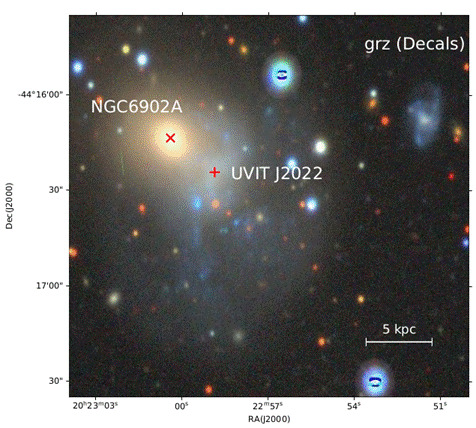 A team of researchers from the Indian Institute of Astrophysics, Bengaluru consisting of Jyoti Yadav, Mousumi Das and Sudhanshu Barway, along with Francoise Combes of College de France, Chaire Galaxies et Cosmologie, Paris, while studying a known interacting galaxy NGC6902A noticed that the colour image (Dark Energy Camera Legacy Survey (DECaLS) colour image) of the south-west outer region of the galaxy NGC 6902A in the shows diffuse blue emission.