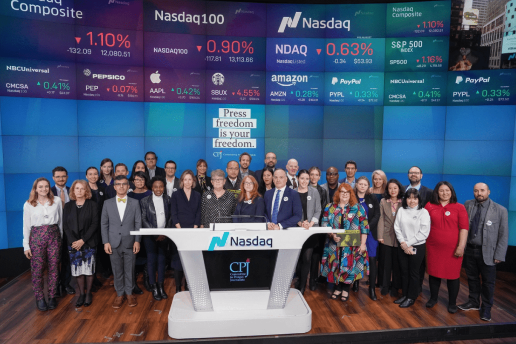 The Committee to Protect Journalists was joined on by prominent journalists and press freedom advocates to ring the opening bell at the Nasdaq MarketSite in Times Square, recognizing 30 years of World Press Freedom Day. The bell ringing ceremony was hosted by Brian Buckley, senior vice president and chief marketing officer at Nasdaq, and included a speech by CPJ President Jodie Ginsberg.